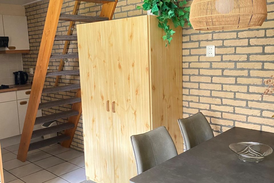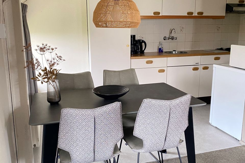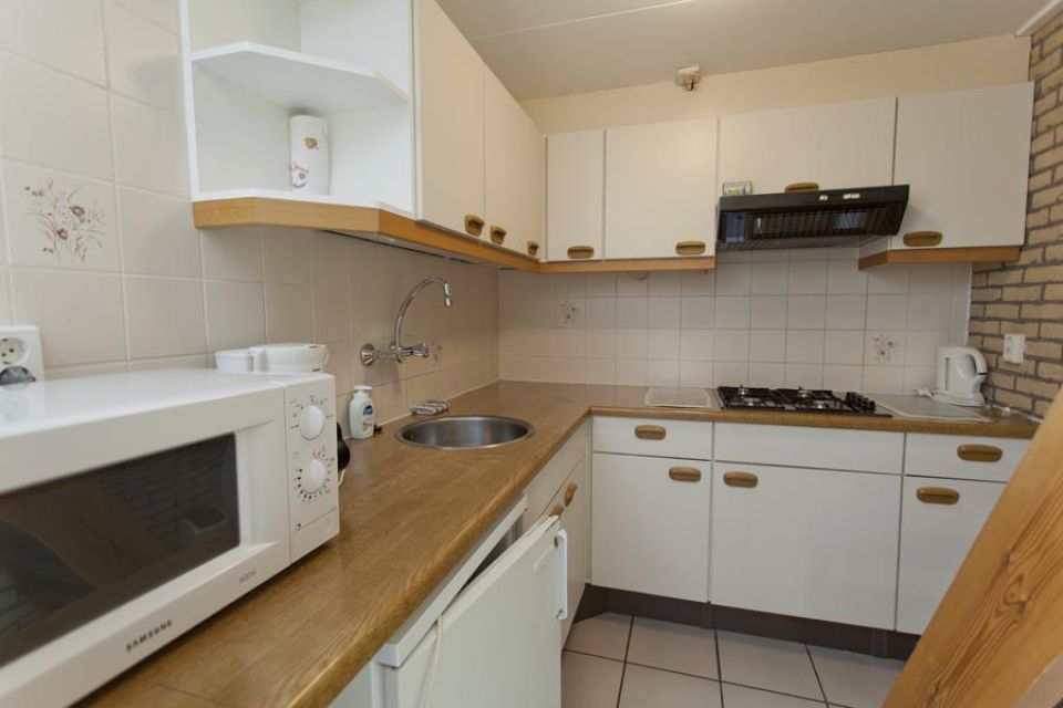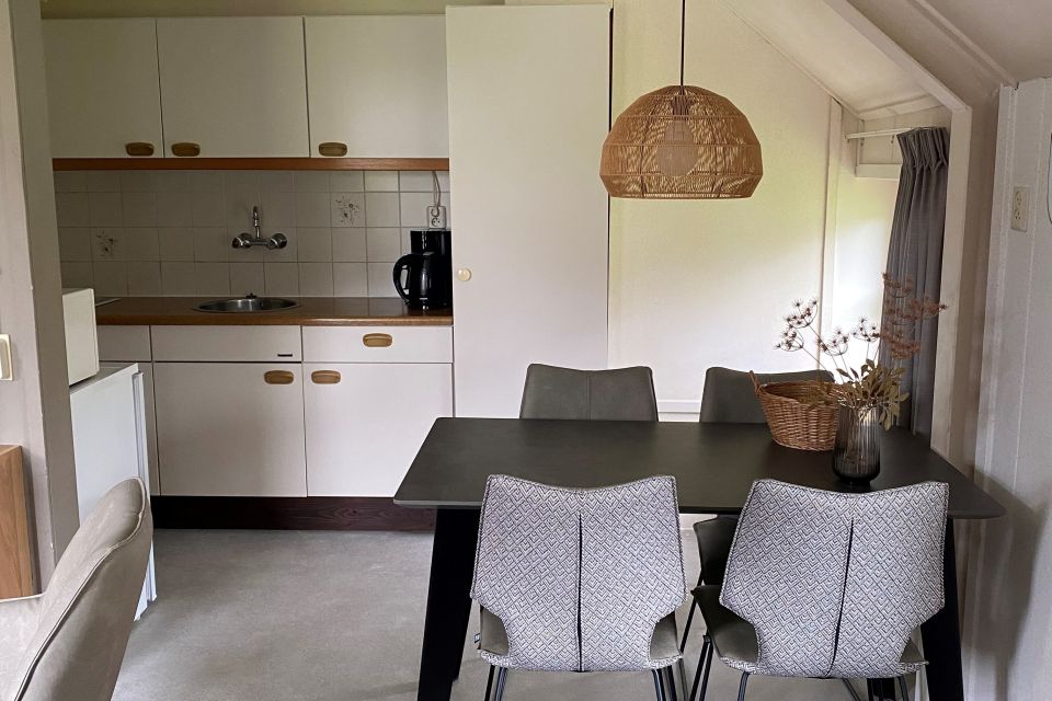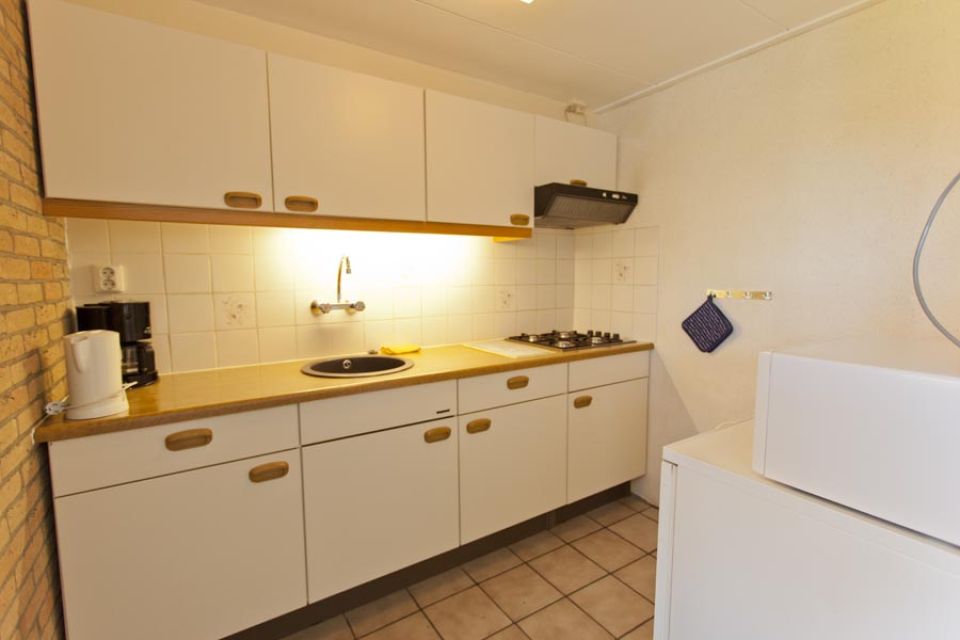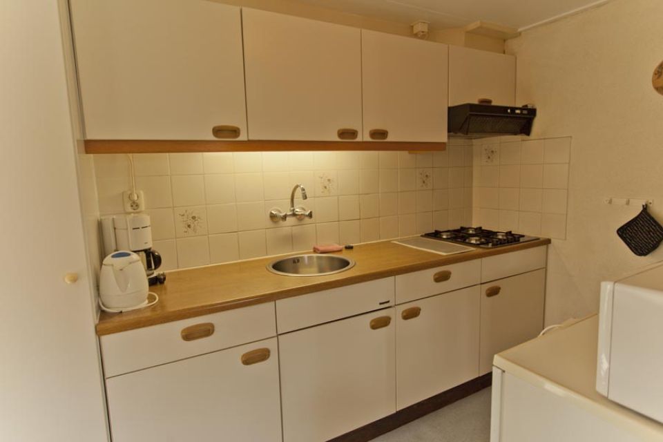 - Open keuken met eethoek, gasstel, afzuigkap, koelkast, koffiezetter, waterkoker, pannen, bestek, etc.