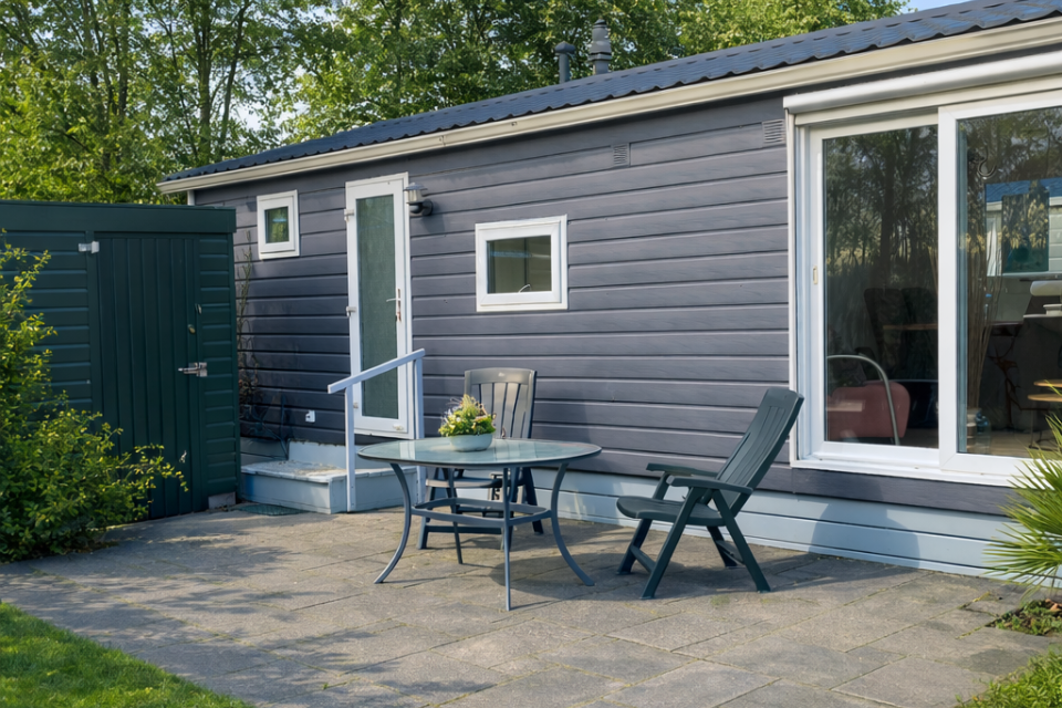 Deze sfeervolle chalet ligt prachtig in een hoek van het perceel, zeer beschut en omgeven door groen. Dankzij de ruime opzet en natuurlijke afscherming geniet je hier van volop privacy en rust. Een heerlijke plek om écht even uit en thuis te zijn.